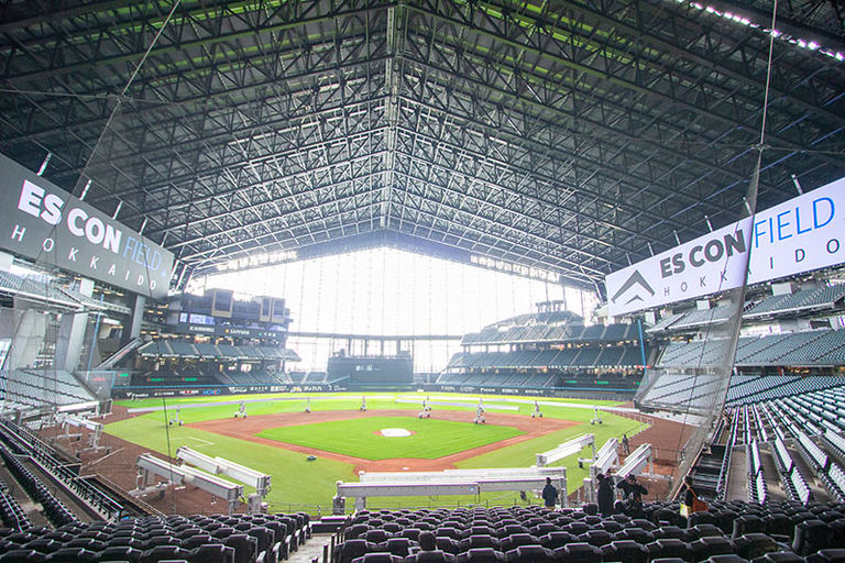 It is in Hokkaido, in northern Japan, and as of last week is the new home of the Hokkaido Nippon-Ham Fighters Japanese baseball team. The 35,000 seat ballpark has twin 86 meter by 16 meter LED display boards. Centerfield was left open so that fans have an unobstructed view of the mountains. For the metric impaired, that’s almost 300 feet wide by more than 50 feet high.
