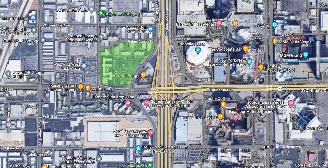 The land is on the other side of the interstate from the T-Mobile Arena where the NHL team plays its games. If you know Vegas well from endless business trips there (I’m closing in on 40 visits), the building site is just off West Tropicana and across the street from an insanely busy In-N-Out Burger outlet.