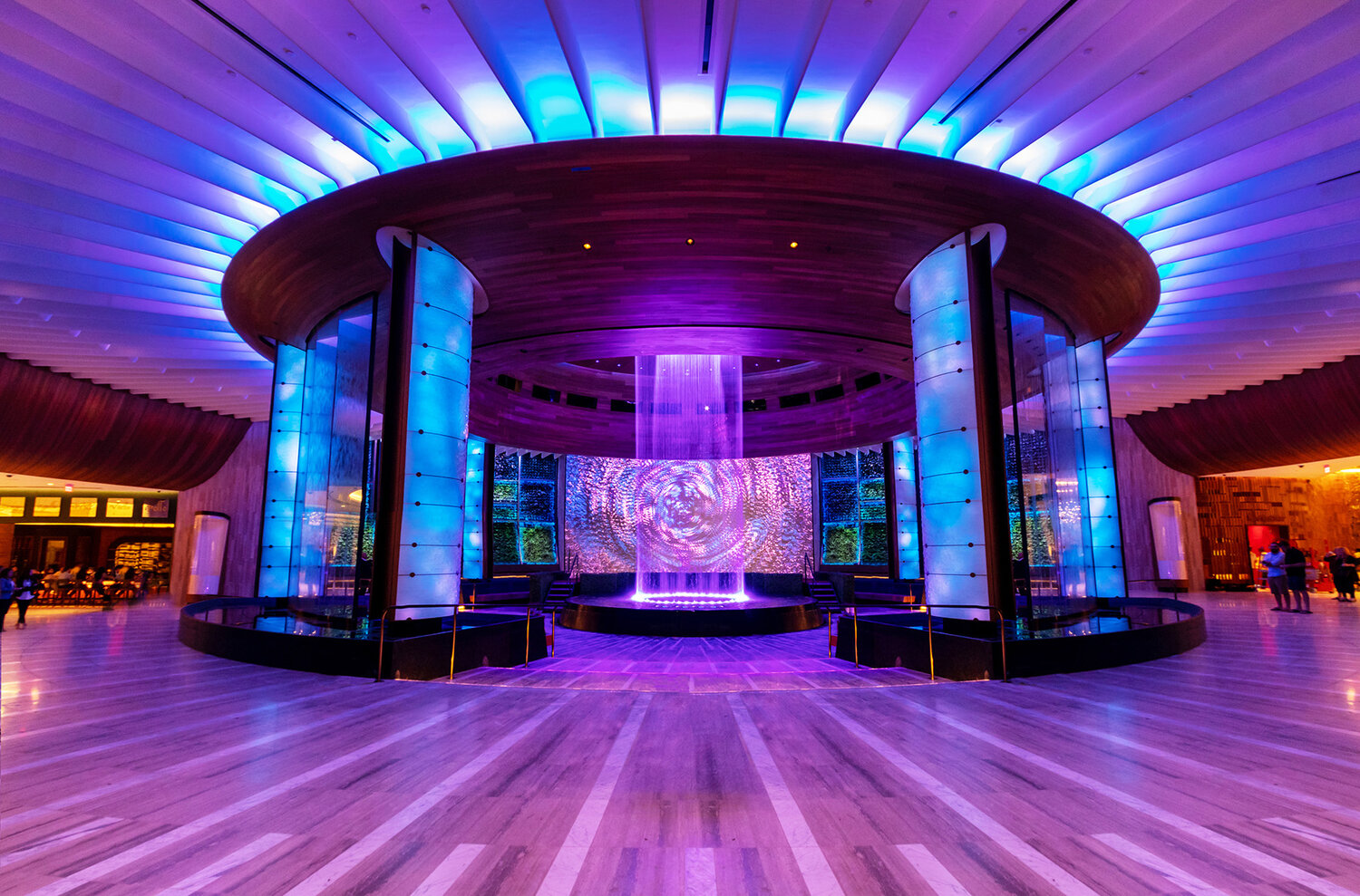 As the nucleus to this new development, it serves as both a gathering and circulation point for millions of yearly visitors. The Oculus embodies how architecture can be used to immerse an audience in a reinvented approach to experiencing music. It interweaves its wooden organic architectural design with concert light production, world-class waterfall choreography, holographic animated projections, and original animated music films with its surrounding green walls and waterfalls. Towering above guests in the center of the Oculus is a 35′ tall waterfall with pulsating rain, gravity-defying water spectacles, and blasts of mist for song finales.