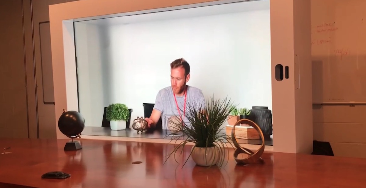Proto has a post and video up on Linkedin and Twitter that shows its shower stall-like enclosure set in landscape mode and elevated to the height of a typical boardroom table or credenza, creating the illusion that the people at that end of the table are actually there and not attending remotely.