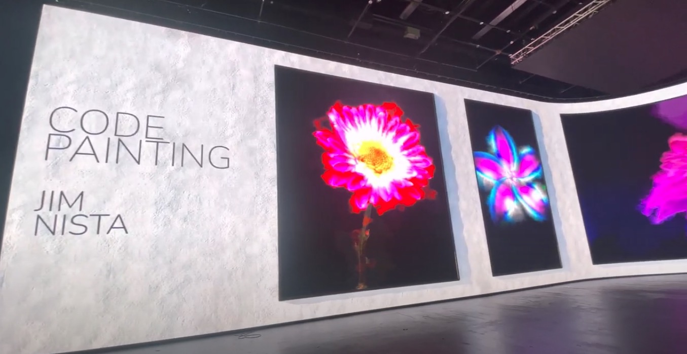 Jim Nista is both a coder and an artist, and has developed generative AI pieces that he calls Code Painting. “One fun-fact about this work is that since it’s all code, the entire project would fit on a floppy disk,” says Nista. “It’s nice to have a video wall project where the deliverable is in kilobytes instead of terabytes.”