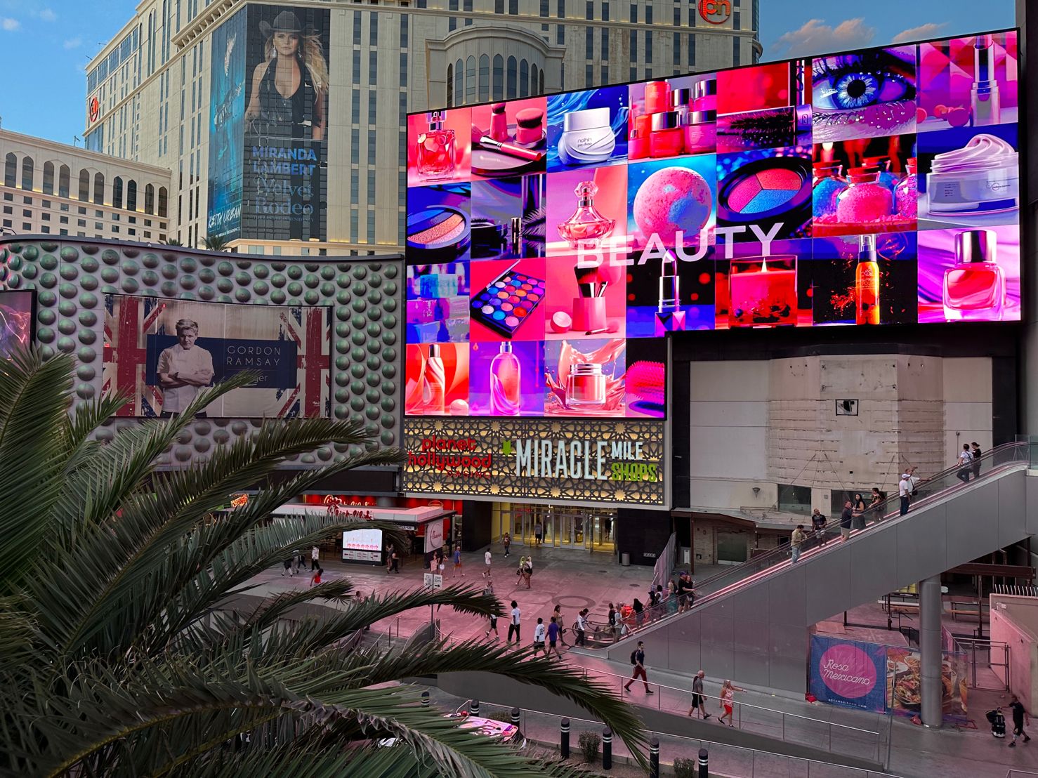 The Miracle Mile Shops mall that’s part of the Planet Hollywood resort in Las Vegas is nearing the end of a much, much needed facelift – and a big visual feature is new LED displays on the outside, facing the Strip.