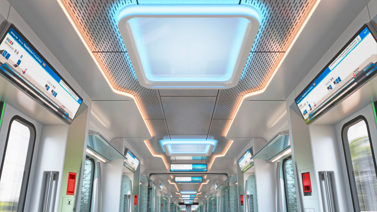 - 104 displays in the interior above the doors, on the ceiling, in the gangways and on the rear walls of the two driver’s cabs. Among other things, they provide information about the next station, the course of the journey, current disruptions and offer space for passenger TV.