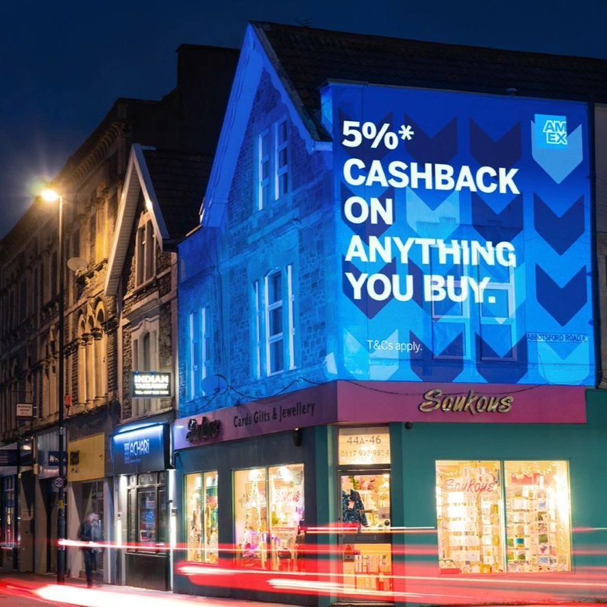This is a campaign for AMEX in the UK, executed by the Ipswich firm Motion Mapping. It’s a shop local campaign and the intent is to blast visuals once the the sun goes down on the sides or faces of those businesses or, I assume, nearby.
