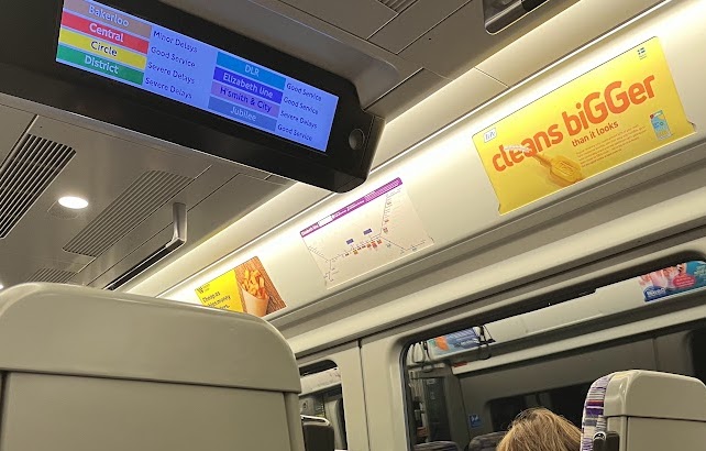 One of the things that struck me is the use of digital. There are multiple bar-type LCDs ceiling mounted in the cars, and they’re not there for peddling mobile carriers, hair products or crisps (potato chips). They’re up there to inform and guide passengers.