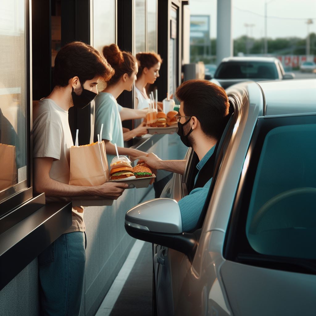 The image above is the output from a prompt in Dalle3 to “create and image of people putting in order from inside car at drive-thru burger restaurant.”
