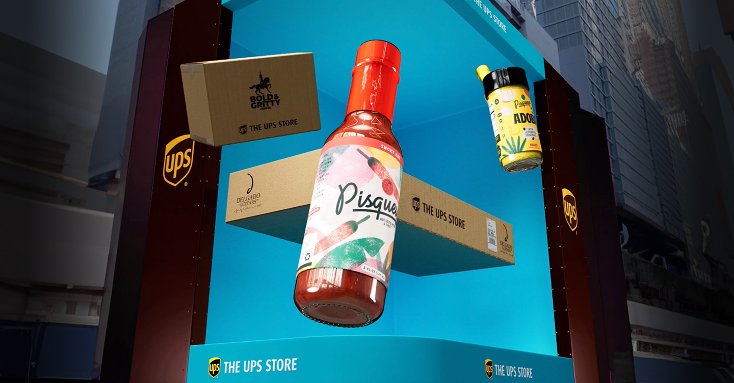 The spot used 3D illusion creative that highlights three small businesses that sell online and deliver via UPS. The hook is how the ready-to-ship package is shown on a conveyor belt and then drops out of view, showing up instead on a screen mounted on the side of the UPS truck.