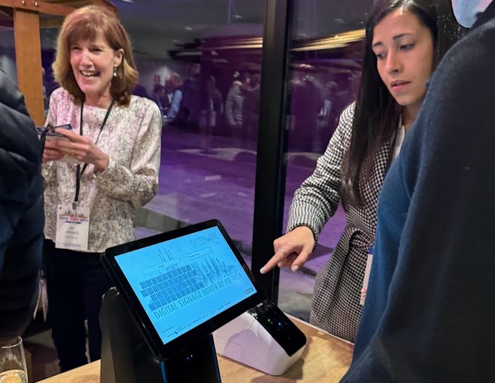 The related Portuguese companies Moviik and DISPLAX helped me FINALLY use technology for checking in attendees. Miguel Fonseca, who runs DISPLAX and is a company co-founder, hand-carried a small kiosk in a backpack from Porto to Barcelona, getting it through airport screening and tucking it, I assume, in an overhead.