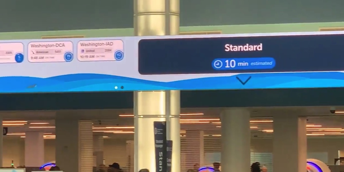 Arrivals tiles on the sign inform the lively “meeter and greeters” who gather here to welcome loved ones. Queue wait times via Xovis are front and center. The entry lanes are easily changed as needed by agents with a tablet interface. Full administration, with complete content control, is enjoyed by the awesome JAX staff! Powered by Art of Context’s web-based Airport Display Platform and running on a single Chromebox.