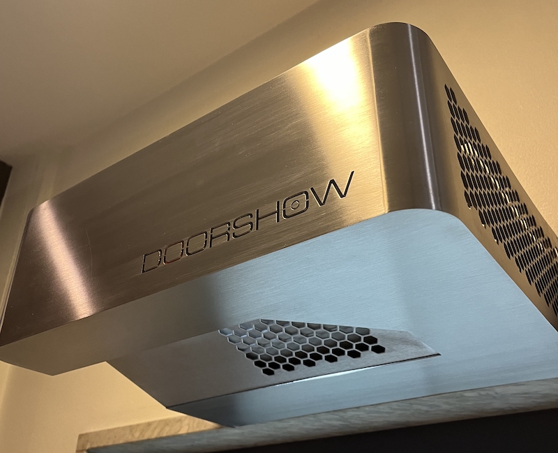 It is a short-throw projector mounted about the door to the hotel’s guest elevator, called Doorshow. The website is all in German but this is a product of Swiss elevator manufacturer Schindler, which has what it calls the Schindler Media Network. That network also includes large format displays inside elevator cabs, on a wall.