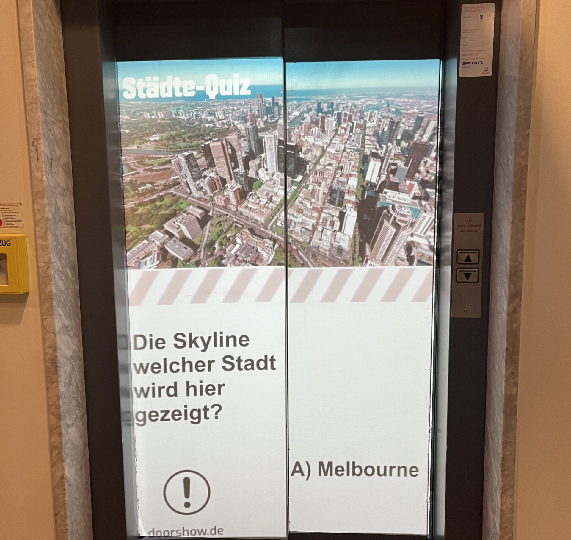 The projection fills much of the steel elevator/lift door. I am not sure there is one on each floor, as I am staying on the hotel’s ground level.