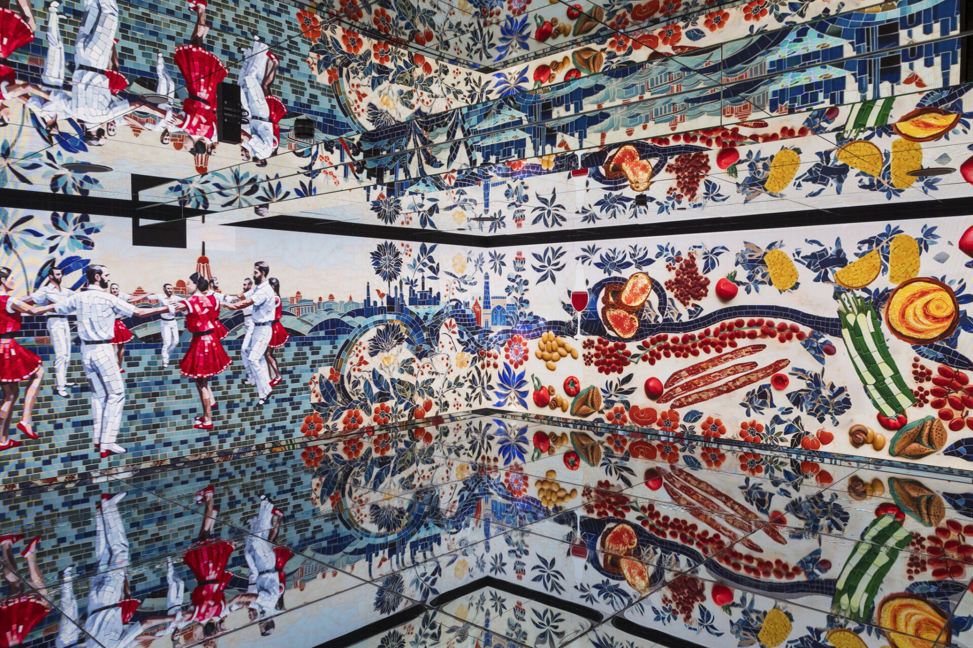 This more representative and less typical approach to local culture is composed of three stages. The audiovisual begins by showing the colors that form the stained glass windows, then goes through the mosaics of Gaudí’s iconic trencadís and ends with a simulation of water and lights that represents the fountains of Montjuïc. With this we seek to immerse you in a digital artistic space with typical elements of Catalan culture and geography.