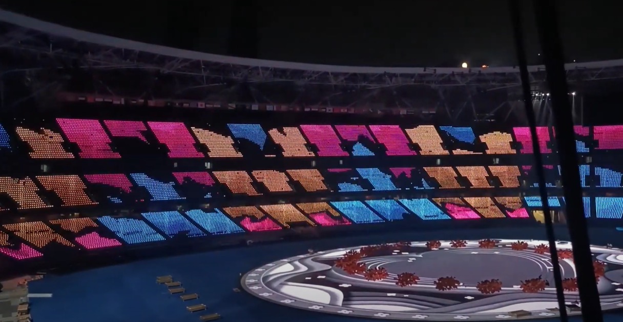 This is a stadium equipped with 35,000 LED “torches” at the seats, with show controls able to sync them all and create large scale visuals.
