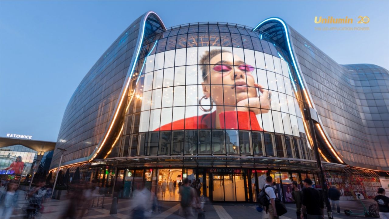 This is 153 sq. meters of semi-transparent LED inside the windows above the entry to a major shopping mall in Katowice, Poland – a DOOH display managed by the Polish media company Screen Network. The media company uses real-time data analysis and engagement metrics on the 90,000 or so sets of eyeballs that are within range of the screen every day.