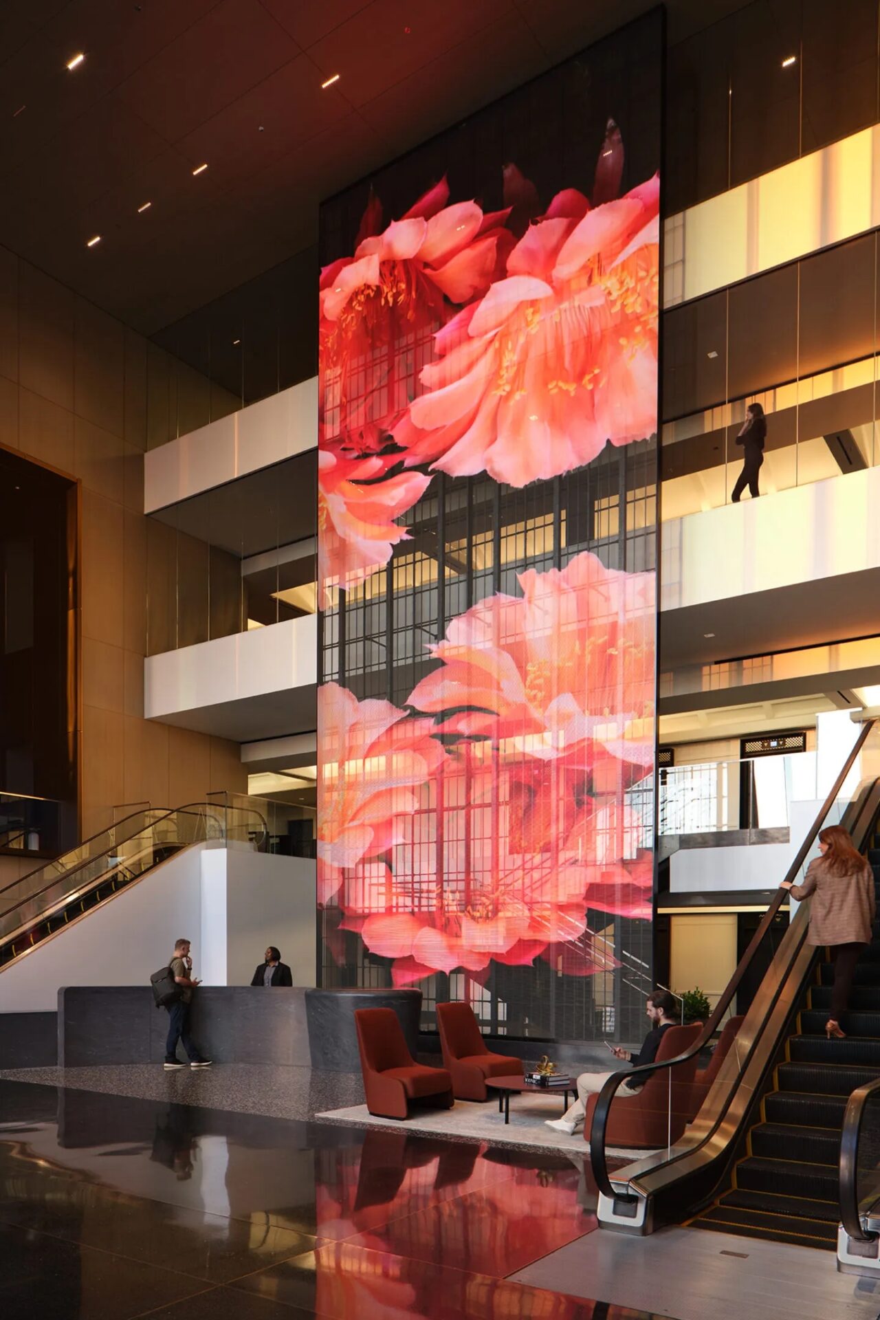 It’s a good example of a design that incorporated a big visual that doesn’t block views or natural light in the lobby, and wouldn’t have introduced a lot of engineering work to accept the structure and weight of a more conventional LED video wall. Mesh products – with the exception of budget stuff – is also getting a lot better looking from the rear, non-illuminated side of the display – so the people walking along that mezzanine passageway won’t feel like they’re in a cage.
