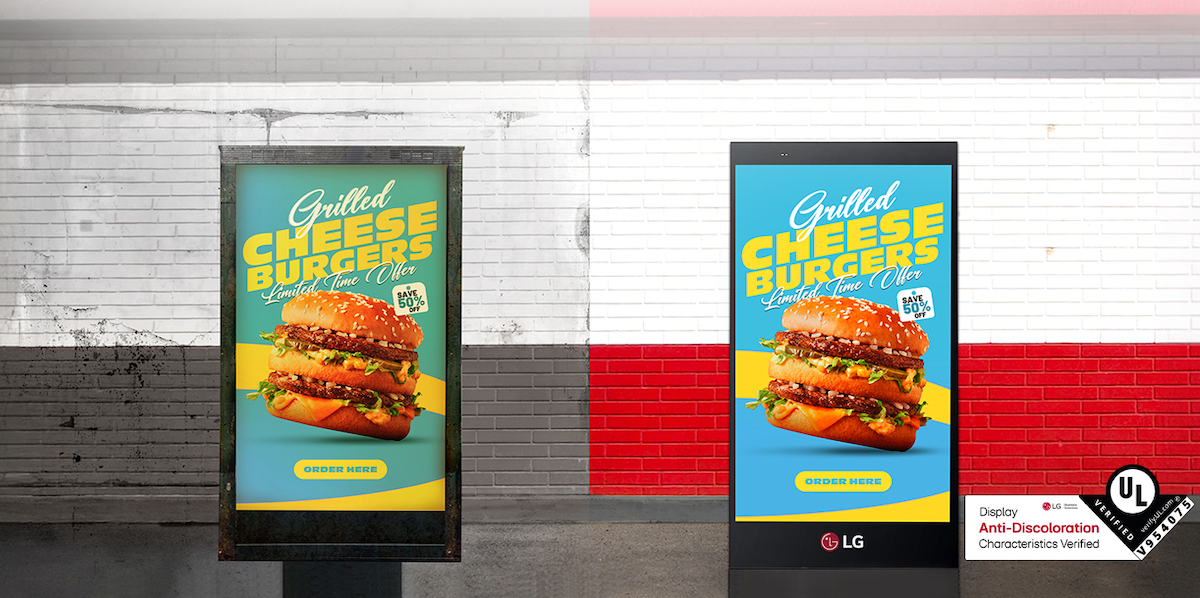 The use of outdoor displays in settings such as drive-thru restaurants, bus stops, schools and sports stadiums has become commonplace in recent years and is steadily increasing across a variety of B2B sectors. However, prolonged exposure to sunlight can cause the screens of these versatile display products to turn a yellowish color over time. LG’s Anti-Discoloration technology helps address this issue, reinforcing the quality and durability of the company’s outdoor digital signage solutions.