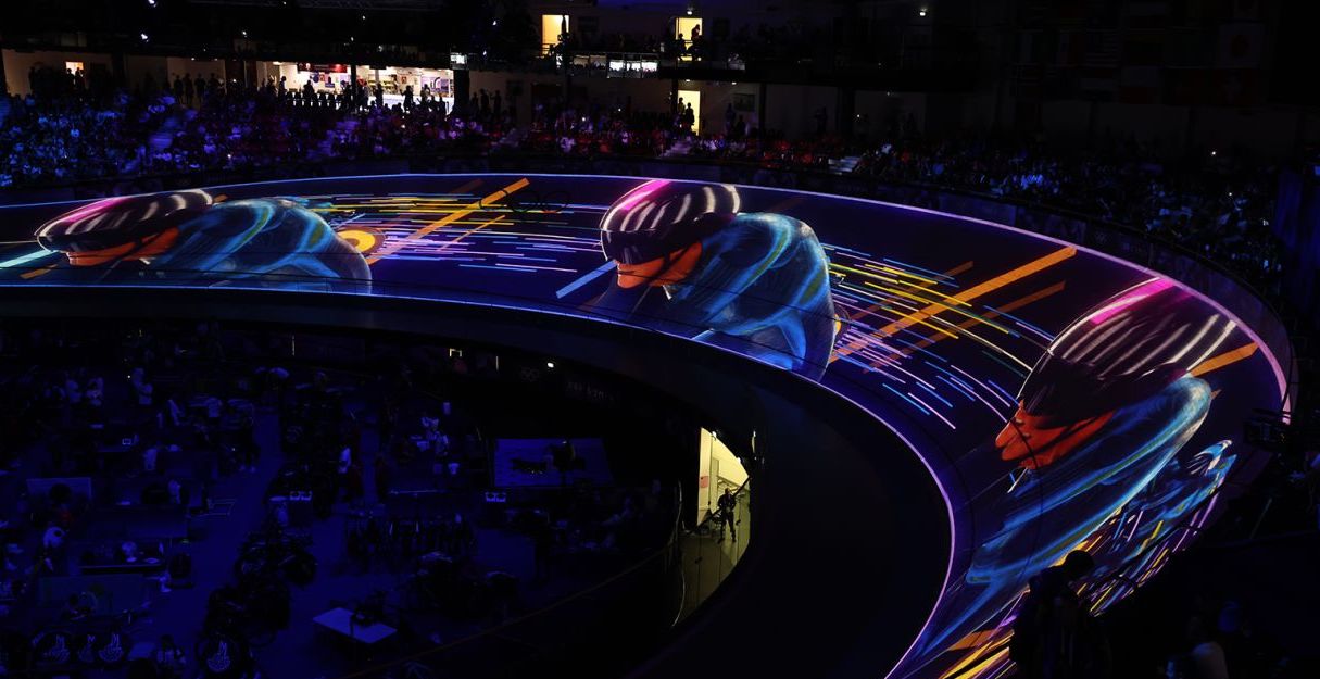 The velodrome in Paris used 40 35K DLP Panasonic projectors to do a pre-show that filled the full track when the lights were down. It is a bit reminiscent of what was done ahead of the sprint finals in athletics during the Tokyo Olympics three years ago. I think there might have been something similar for the sprints this time around, but can’t find anything online to back up my possibly flawed recollection.