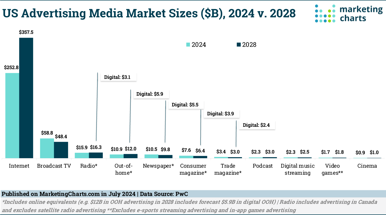 OOH ranks behind online, broadcast TV and radio, with online by far the biggest ad business. PwC forecasts that online advertising spending will be $252.8 billion this year ad rise to $357.5 billion by 2028.