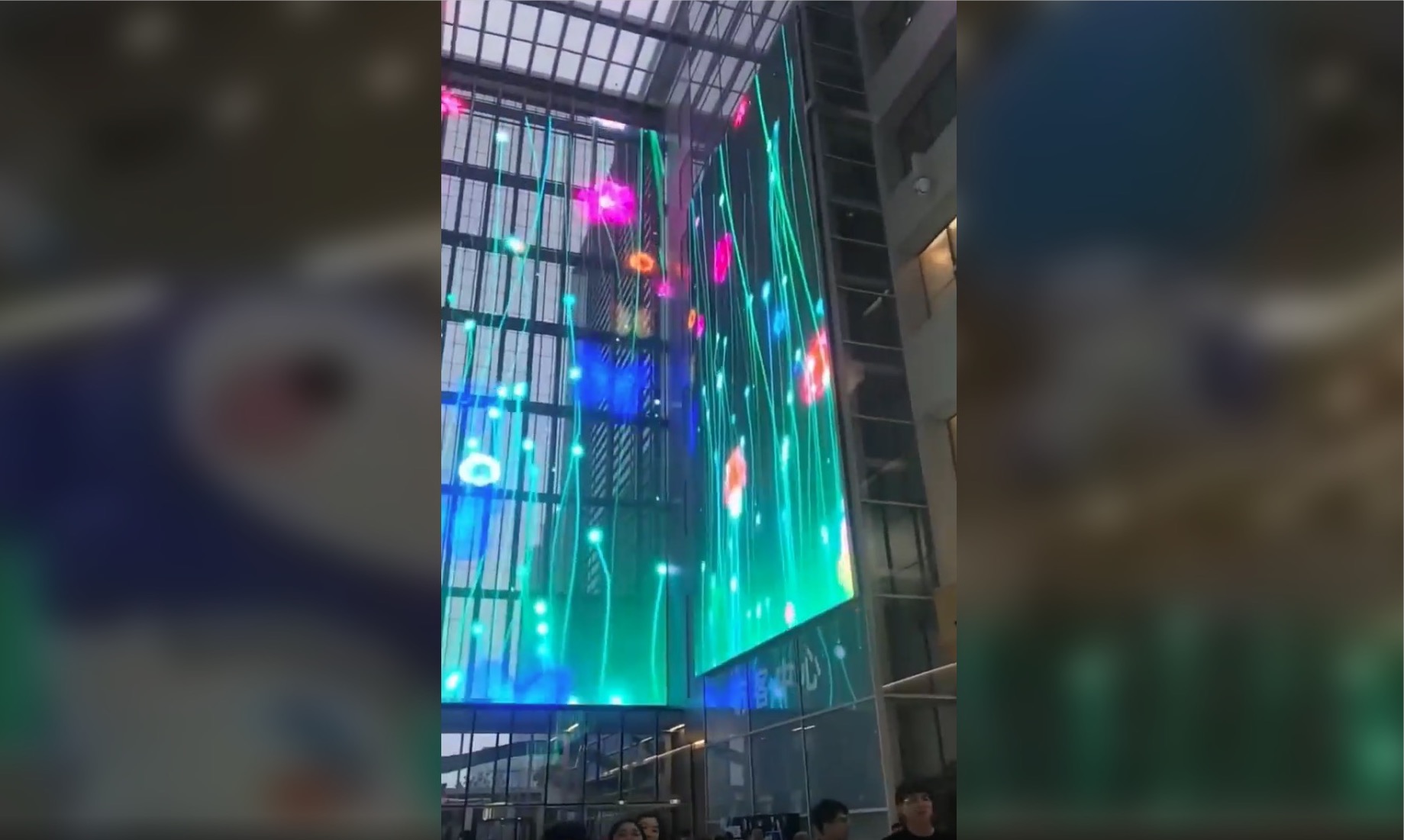 This is a very nice use of some sort of near-transparent LED display product in a shopping mall in China, using displays from a Shenzhen company called Kezy Tech. I think it is one of those flexible films that can be adhered to glass, like on the glass railing panels on the different floors of this mall … wherever it is.