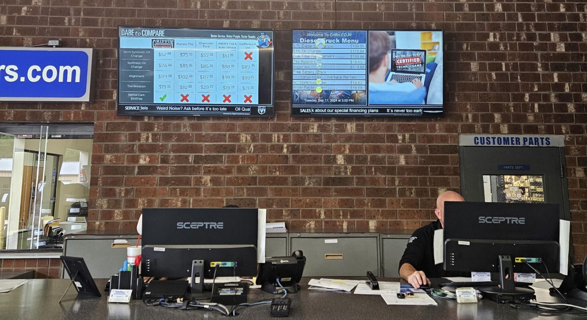 I’ve seen numerous menus in dealerships showing services, fees and promotions. I don’t think I have seen this, though – a dealer in North Carolina that has a mildly cheeky chart behind the service counter that compares its fees to those of competing companies in the area.