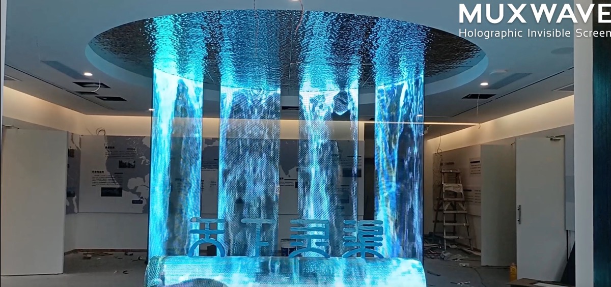 The flowery descriptions and misuse of holographic and invisible are a bit much, but this installation using super-thin mesh-like display panels made by the Chinese company Muxwave is nonetheless interesting.