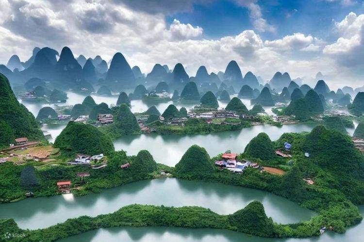 This is the lobby of the exhibition hall in Lingqu Park, Guilin, Guangxi, China, which celebrates the beauty of Guilin’s landscape. Guilin is the region in China that has all those amazing limestone hills that tower over the landscape.