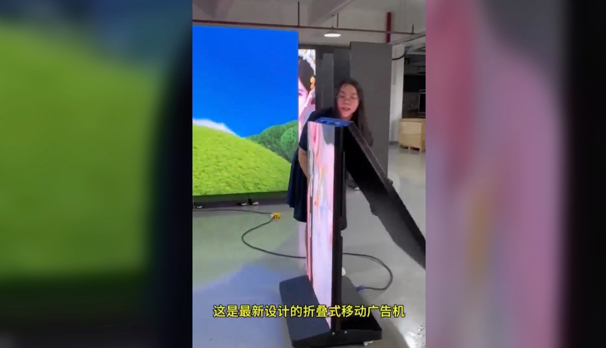 I’ve seen at trade shows a few versions of LED poster columns that can be pushed together to make larger displays, but I don’t think I’ve seen one that folds in half to create a shorter, back-to-back display for marketing inside or outside operations like retail or hospitality.