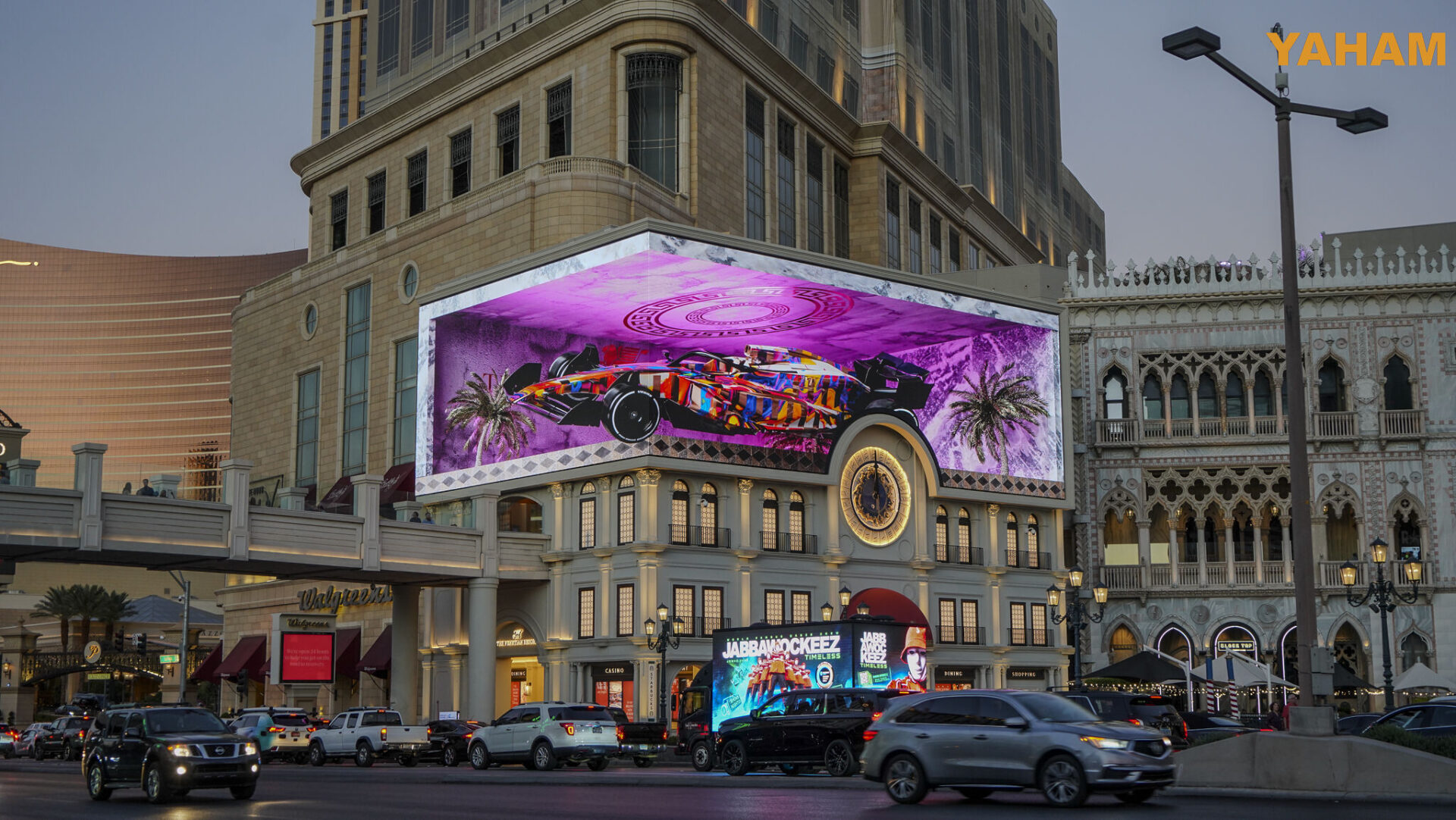 It is a corner display at The Venetian, and while these 90-degree installs are commonplace these days, what’s interesting is how the display was built to work with the architecture and the archway, instead of overlapping it. The LED display tech is from the Chinese firm YAHAM, which seems to do very well in the Vegas market but I don’t hear much from them in other parts of the U.S..