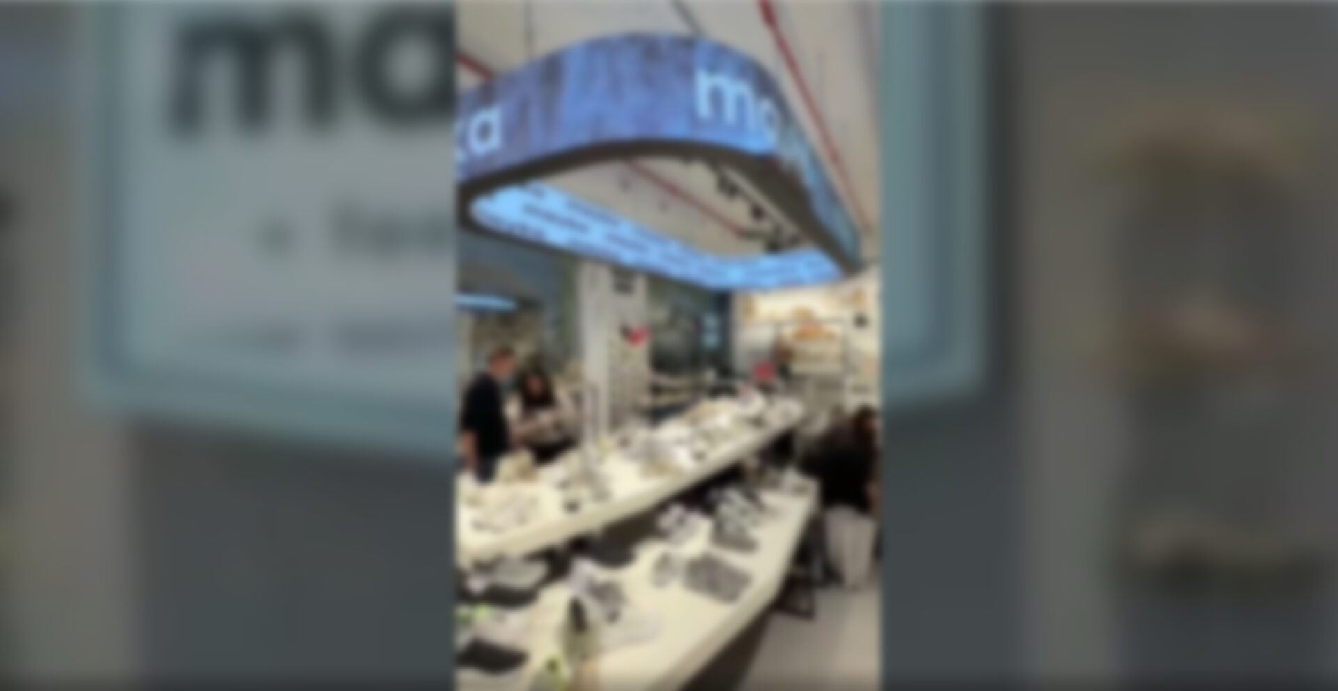This is a Mayka footwear store in a mall in Alicante, Spain. The store, open since 2012, was recently renovated, with the addition of a rounded rectangle (which I have just learned can also be called a squircle!) made up of LED modules on the outer and inner loops. Suspended from the ceiling, it is the same rough shape as the halo displays that have started being used in sports arenas and stadiums.