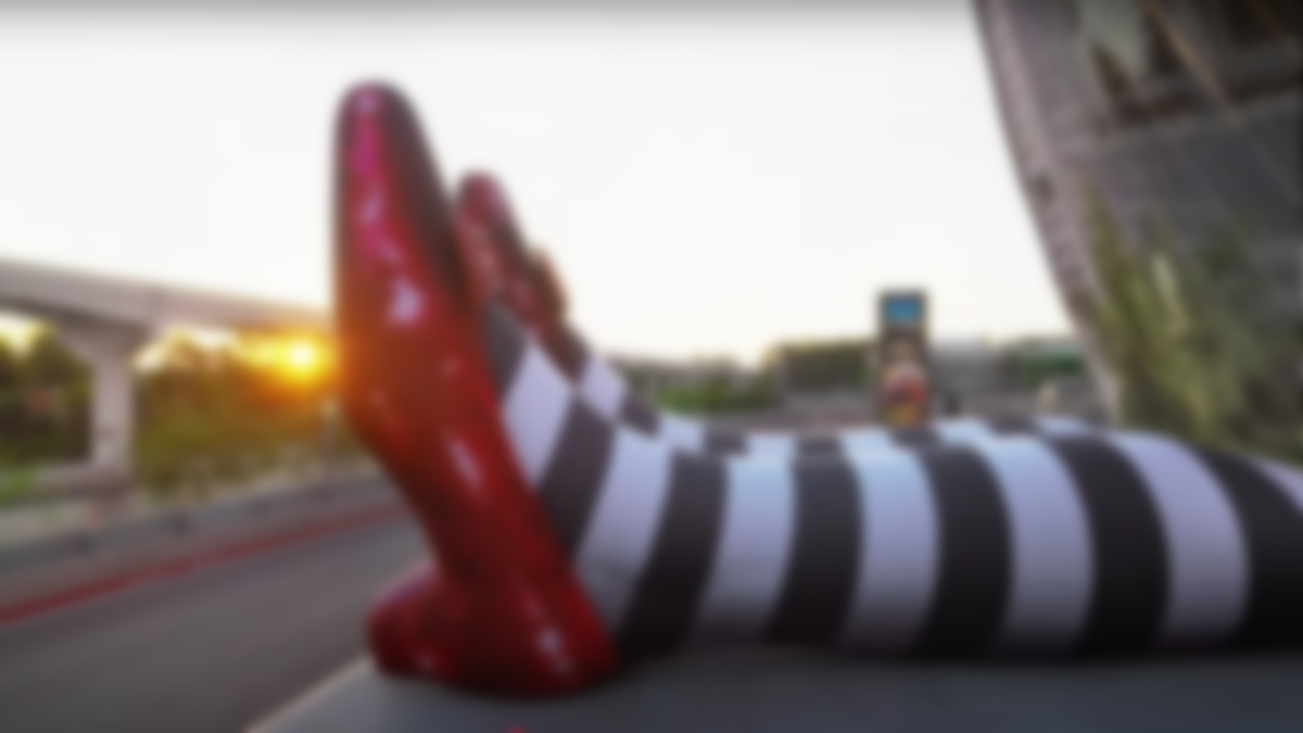 The show premieres on August 23, but promotion for the show on the Sphere’s outdoor LED screen is already in full swing. And for the first time, a physical element has been added: 15-meter-long legs wearing 6.7-meter-high red slippers stretch out from the exosphere. During the promo, the exterior screen shows the scene where Dorothy’s farmhouse falls from a whirlwind and lands on the witch.
