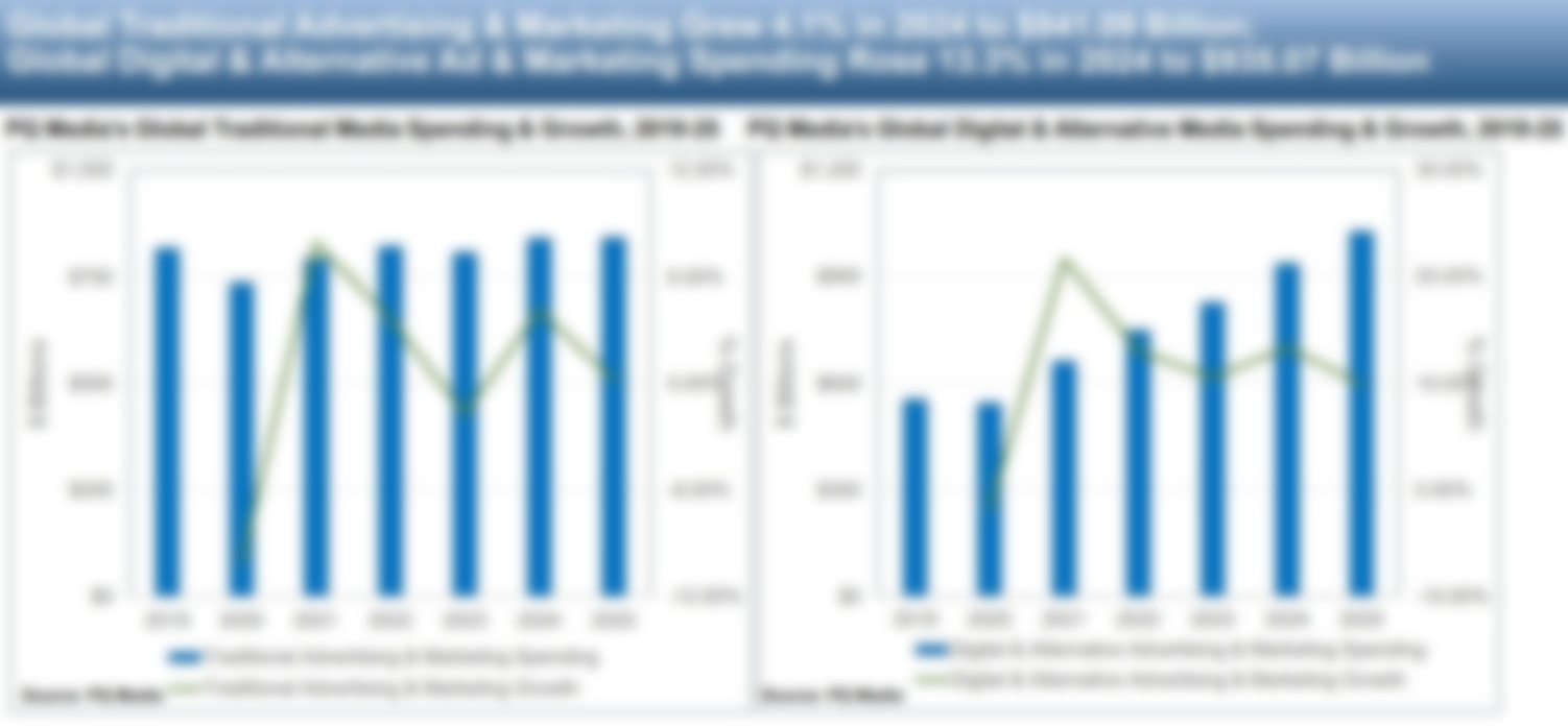 In the traditional advertising and marketing segment, global spending declined 4.1 percent in 2024 to $841.09 billion. Traditional advertising fell 4.5 percent to $422.01 billion, and traditional marketing dropped 3.7 percent to $419.08 billion. This category is expected to experience a slight rebound, with a projected 0.2 percent increase in 2025.