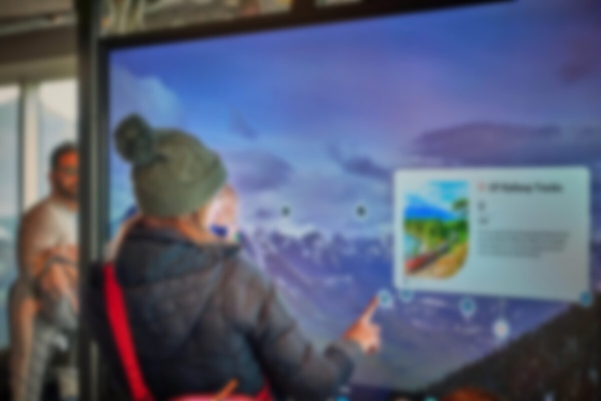 Developed in collaboration with Electrosonic, the new Scout Panels combine large-format design with custom-built Cloud Vision software from Dimensional Innovations. Each 105-inch interactive touchscreen is housed in topography-etched frames aligned with actual sightlines from the summit. Users can explore peaks, valleys, and waterways in detail, with environmental states that shift from sunlight to alpenglow to the northern lights.