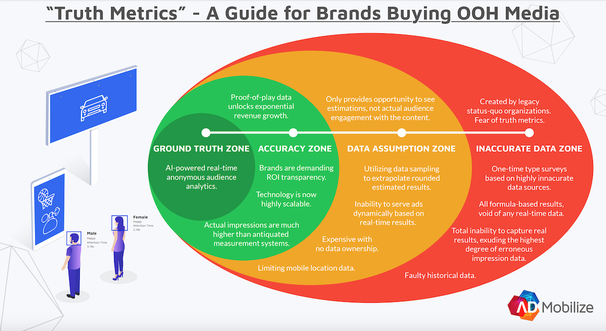 Infographic: The “Truth Metrics” Of OOH Advertising December 19, 2019 by Super User Miami-based computer vision and analytics company AdMobilize has pushed out an interesting email with an infographic looking at what it calls Truth Metrics. The premise of the graphic, in relation to out of home advertising, is how accuracy and validity of audience measurement goes from AI-powered anonymous audience analytics using cameras and all the way …