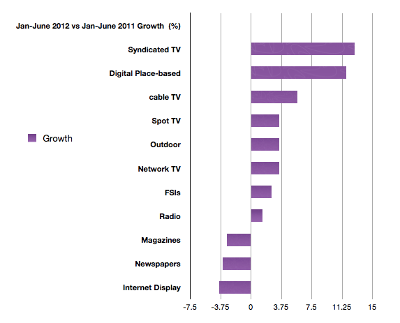 DPAA Says Sector Growing At 6X Pace Of Media In General October 10, 2012 by Super User The Digital Place-based Advertising Association says the sector it bangs its drums about grew at roughly six times the pace of total measured ad spending. The data from Miller, Kaplan, Arase suggests digital place-based media grew by 11.8% from Jan-June 2012 over the same period last year, comparing that against Kantar Media data that shows total …