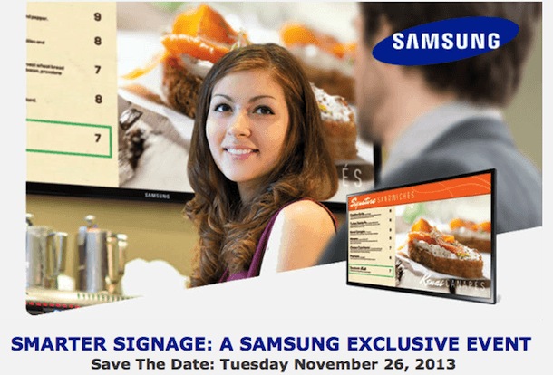Samsung Canada Smart Signage Event Set For Toronto November 11, 2013 by Super User The Canadian wing of Samsung has organized a half-day event intended to get digital signage integrators and distributors, as well as web developers, up the curve on its Smart Signage system on chip panel series. It’s a half-day conference that includes a lunch break and time to dig into what the technology is all about. …