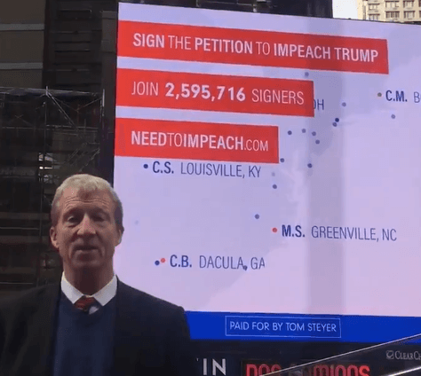 Times Square LED Boards Use Petition Data To Drive Impeach Trump Campaign November 20, 2017 by Super User Setting the undoubtedly polarizing politics aside, a media buy involving a couple of big digital boards in Times Square looks interesting for what it is doing with visualized data. Maybe the content presentation is canned in some way, but it LOOKS like a private U.S. citizen’s big dollar effort to see President Trump impeached is …