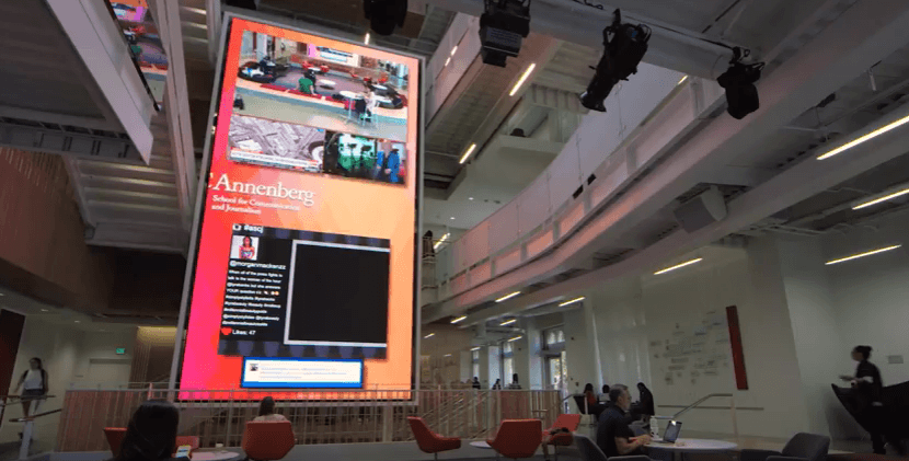 Projects: 3-Storey Floating LED Wall Greets USC J-School Students July 20, 2017 by Super User This is the student atrium in the newly-built Annenberg Hall at the University of Southern California in LA, which has a showpiece 3-storey-tall display intended to draw the attention of students, possibly even getting them to look up from their smartphones. The hall is part of the ?Annenberg School for Communication and Journalism. The five-storey student …