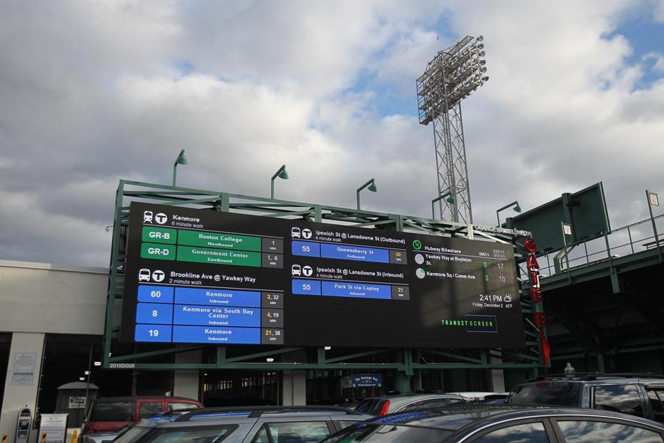 TransitScreen Gets Into Outdoor Ad Business, Sorta, With New Fenway Billboard December 8, 2016 by Super User The guys at Washington, DC-based TransitScreen are trying out a very different spin on its community data displays – partnering on a large LED billboard in the shadows of Boston’s famed Fenway Park baseball stadium. The board on Lansdowne Street shows information on subway, commuter rail, and bus departure times near Fenway, along with what’s …