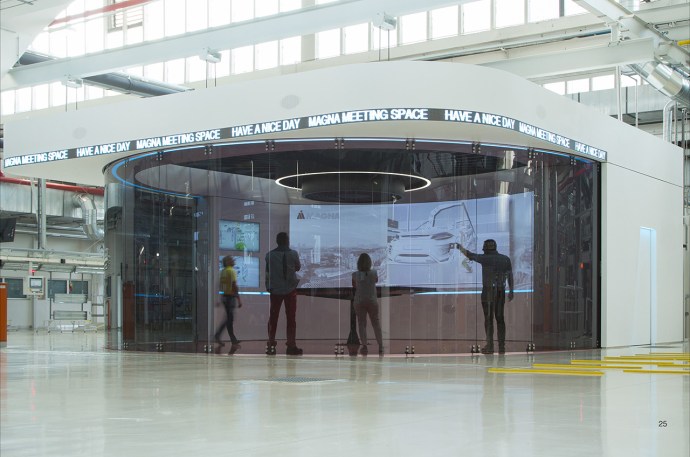 Magna Puts Vast Immersive Meeting Space On Auto Plant Floor August 14, 2018 by Super User This is a seriously whizzy-bangy meeting room space that’s interesting mainly because it is located in the heart of the production floor of a contract auto manufacturer. I’ve been in an auto plant and with everything happening, everywhere, it’s a dirty, power-spiking, really challenging place to be dropping in a lot of high-tech visual systems. …